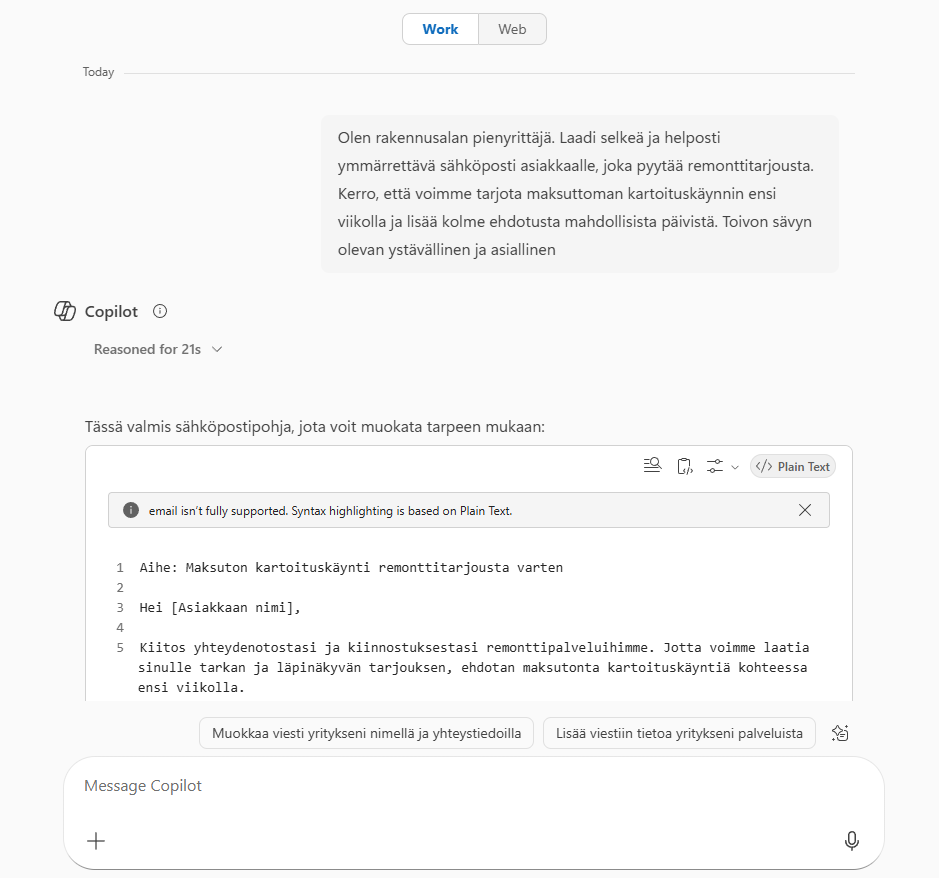 “Olen rakennusalan pienyrittäjä. Laadi selkeä ja helposti ymmärrettävä sähköposti asiakkaalle, joka pyytää remonttitarjousta. Kerro, että voimme tarjota maksuttoman kartoituskäynnin ensi viikolla ja lisää kolme ehdotusta mahdollisista päivistä. Toivon sävyn olevan ystävällinen ja asiallinen.”